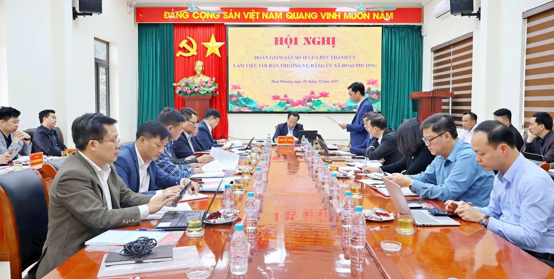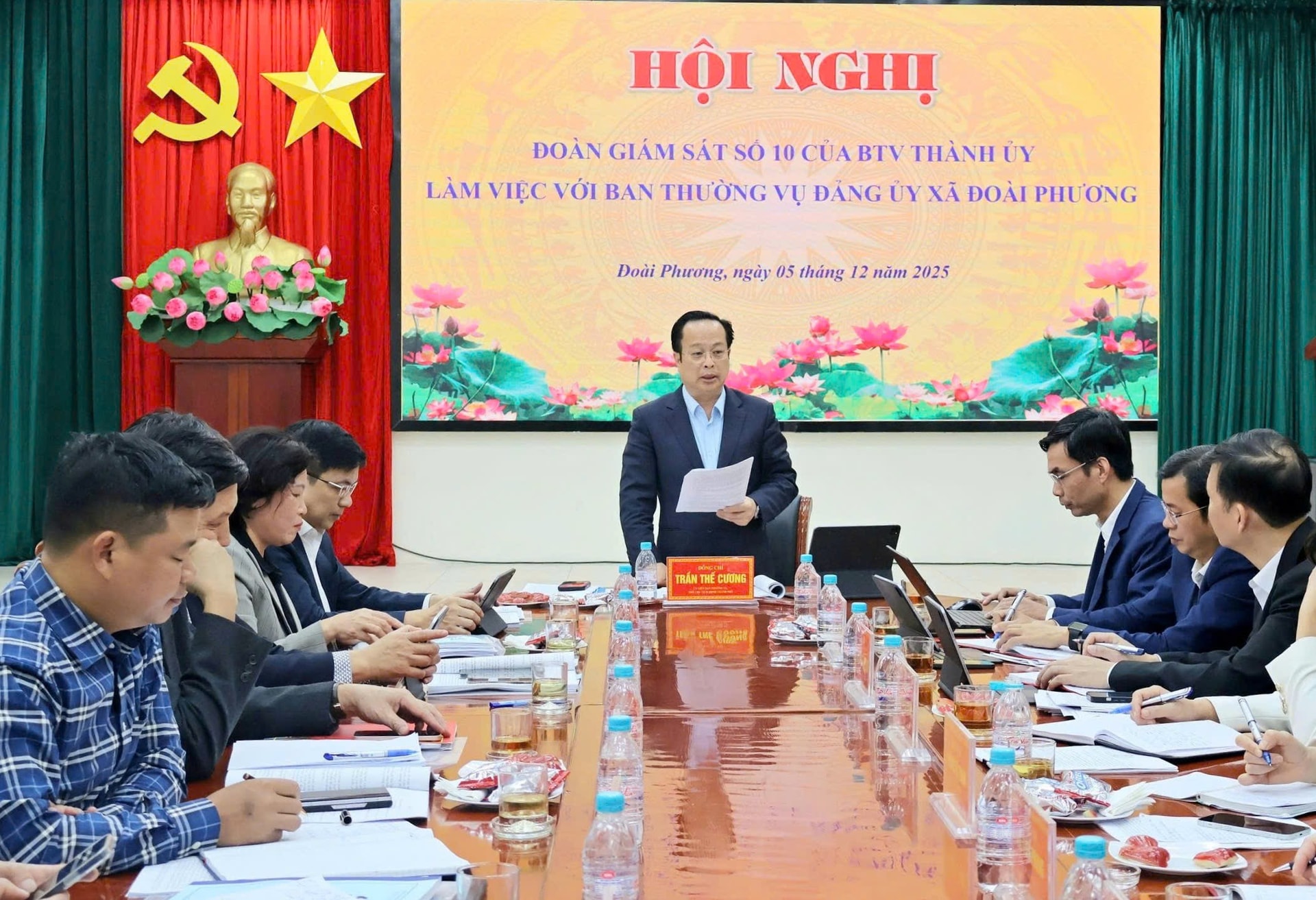 Chiều 05/12/2025, Đoàn Giám sát số 10 của Ban Thường vụ Thành ủy Hà Nội do Ủy viên Ban Thường vụ Thành ủy, Phó Chủ tịch Thường trực HĐND thành phố Hà Nội Trần Thế Cương làm Trưởng đoàn, thực hiện giám sát công tác lãnh đạo, chỉ đạo, tổ chức thực hiện một số chuyên đề trọng tâm, cấp bách gắn với công tác kiểm điểm cuối năm 2025 tại xã Đoài Phương.