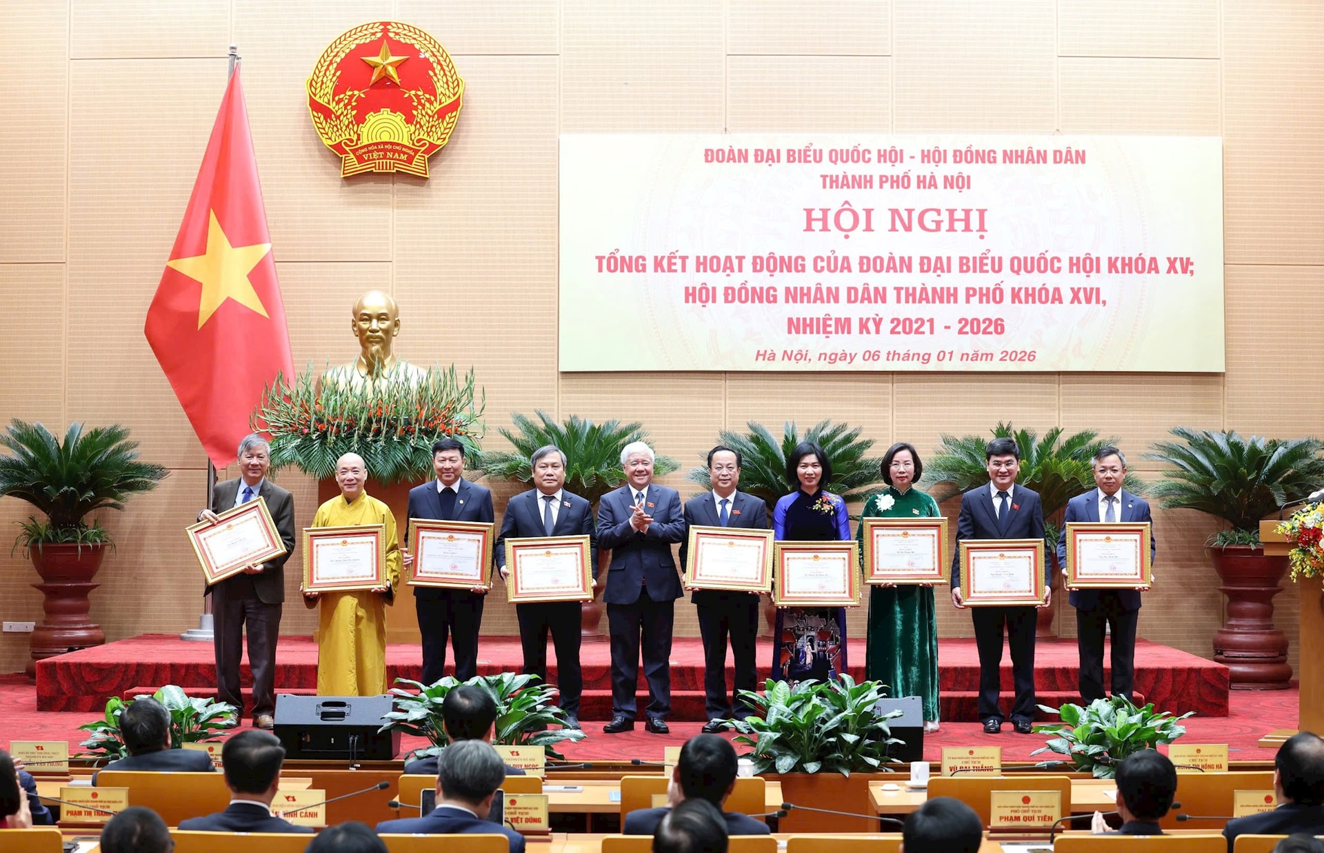 Với những kết quả nổi bật trên, tại hội nghị, Ủy ban Thường vụ Quốc hội đã tặng Bằng khen cho 3 tập thể, 7 cá nhân có thành tích xuất sắc trong hoạt động của Đoàn đại biểu Quốc hội khóa XV; Ủy ban Thường vụ Quốc hội tặng Kỷ niệm chương “Vì sự nghiệp Quốc hội Việt Nam” cho 7 cá nhân; UBND thành phố tặng Kỷ niệm chương “Vì sự nghiệp xây dựng, bảo vệ và phát triển Thủ đô Hà Nội” cho 10 cá nhân. Ban Thường vụ Thành ủy, UBND thành phố Hà Nội tặng Bằng khen cho 33 tập thể, 216 cá nhân có thành tích xuất sắc trong hoạt động của Đoàn đại biểu Quốc hội và HĐND thành phố, nhiệm kỳ 2021-2026.