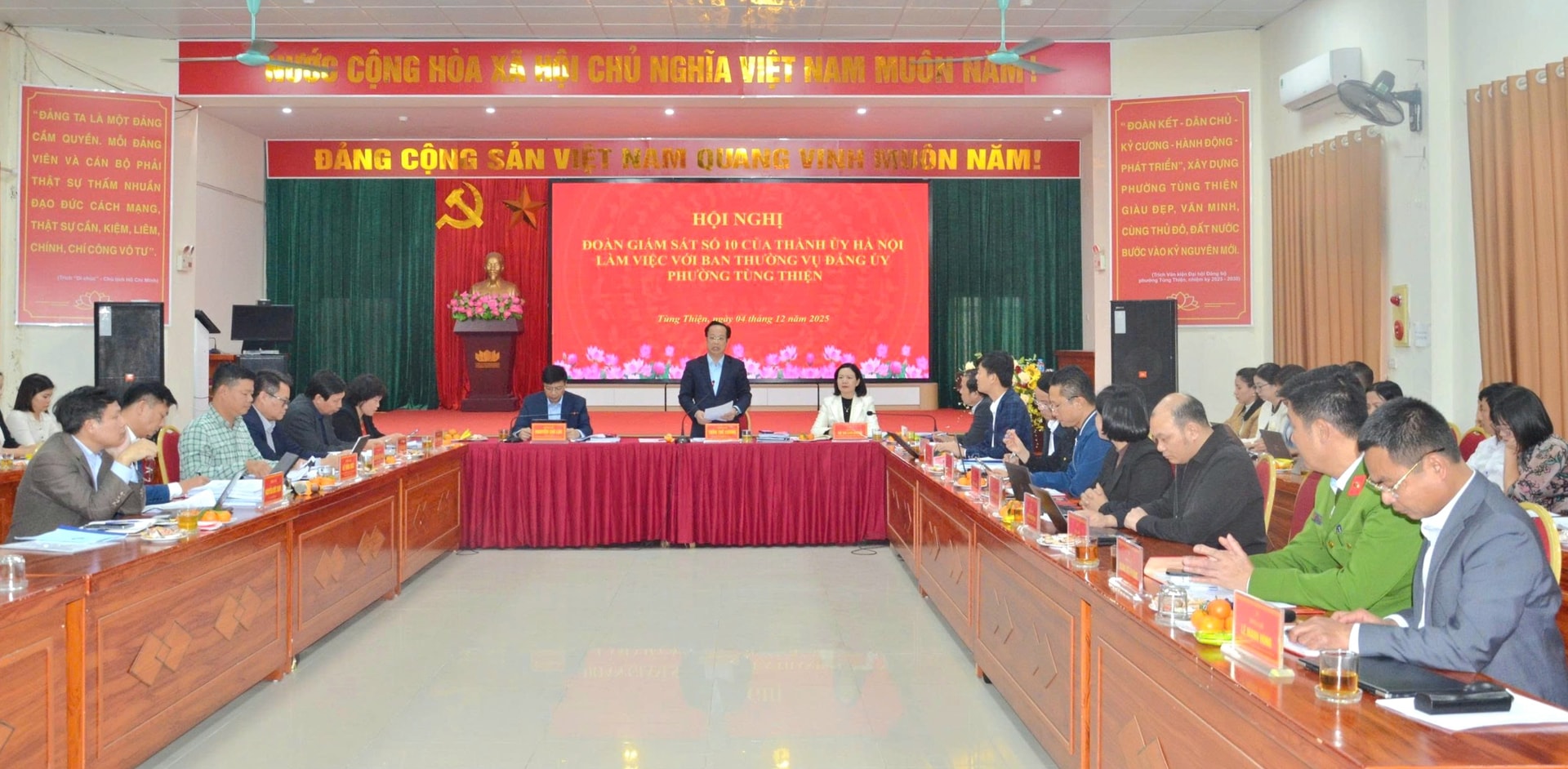 Chiều 04/12/2025, Đoàn Giám sát số 10 của Ban Thường vụ Thành ủy Hà Nội do Ủy viên Ban Thường vụ Thành ủy, Phó Chủ tịch Thường trực HĐND thành phố Hà Nội Trần Thế Cương làm Trưởng đoàn, đã có buổi làm việc với Ban Thường vụ Đảng ủy phường Tùng Thiện để giám sát công tác lãnh đạo, chỉ đạo, tổ chức thực hiện một số chuyên đề trọng tâm, cấp bách gắn với công tác kiểm điểm cuối năm 2025.