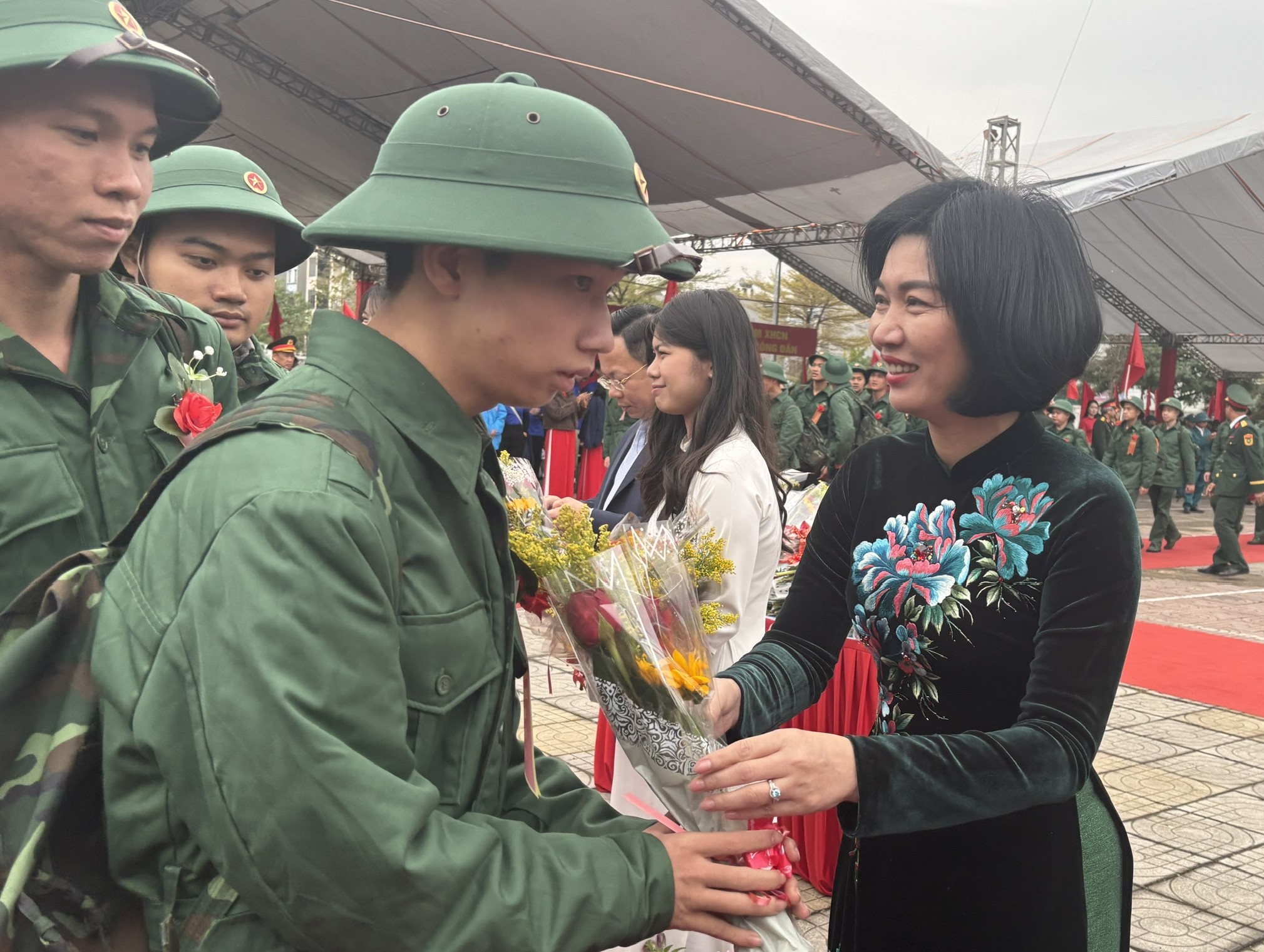 Đồng chí Phùng Thị Hồng Hà dự lễ giao, nhận quân tại điểm giao, nhận quân số 6