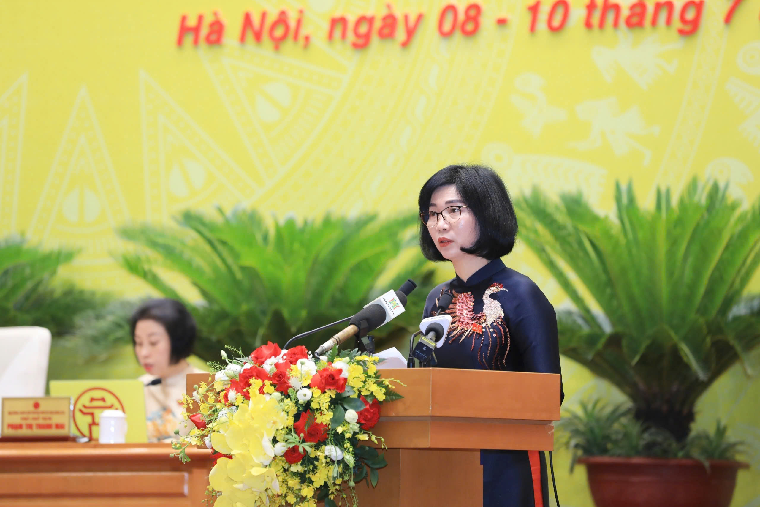 Phó Chủ tịch Thường trực HĐND thành phố Phùng Thị Hồng Hà báo cáo tại kỳ họp