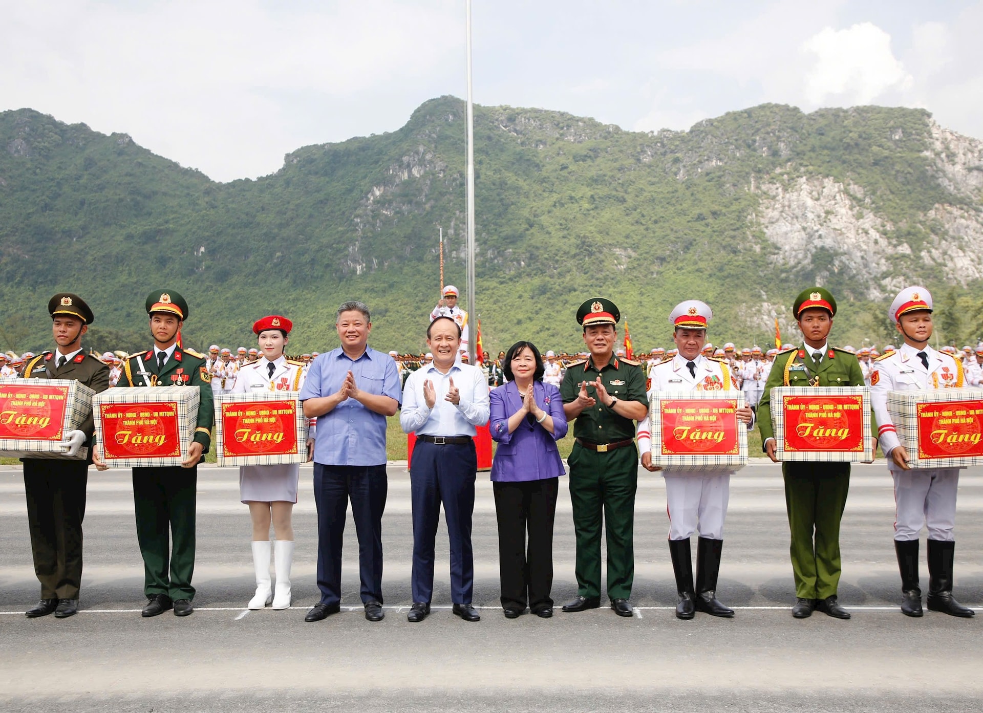 Bí thư Thành ủy Hà Nội Bùi Thị Minh Hoài, Chủ tịch HĐND thành phố Hà Nội Nguyễn Ngọc Tuấn và Phó Chủ tịch UBND thành phố Hà Nội Nguyễn Mạnh Quyền trao quà tặng các lực lượng Quân đội, Công an tham gia tập luyện diễu binh, diễu hành A80. Ảnh: Viết Thành