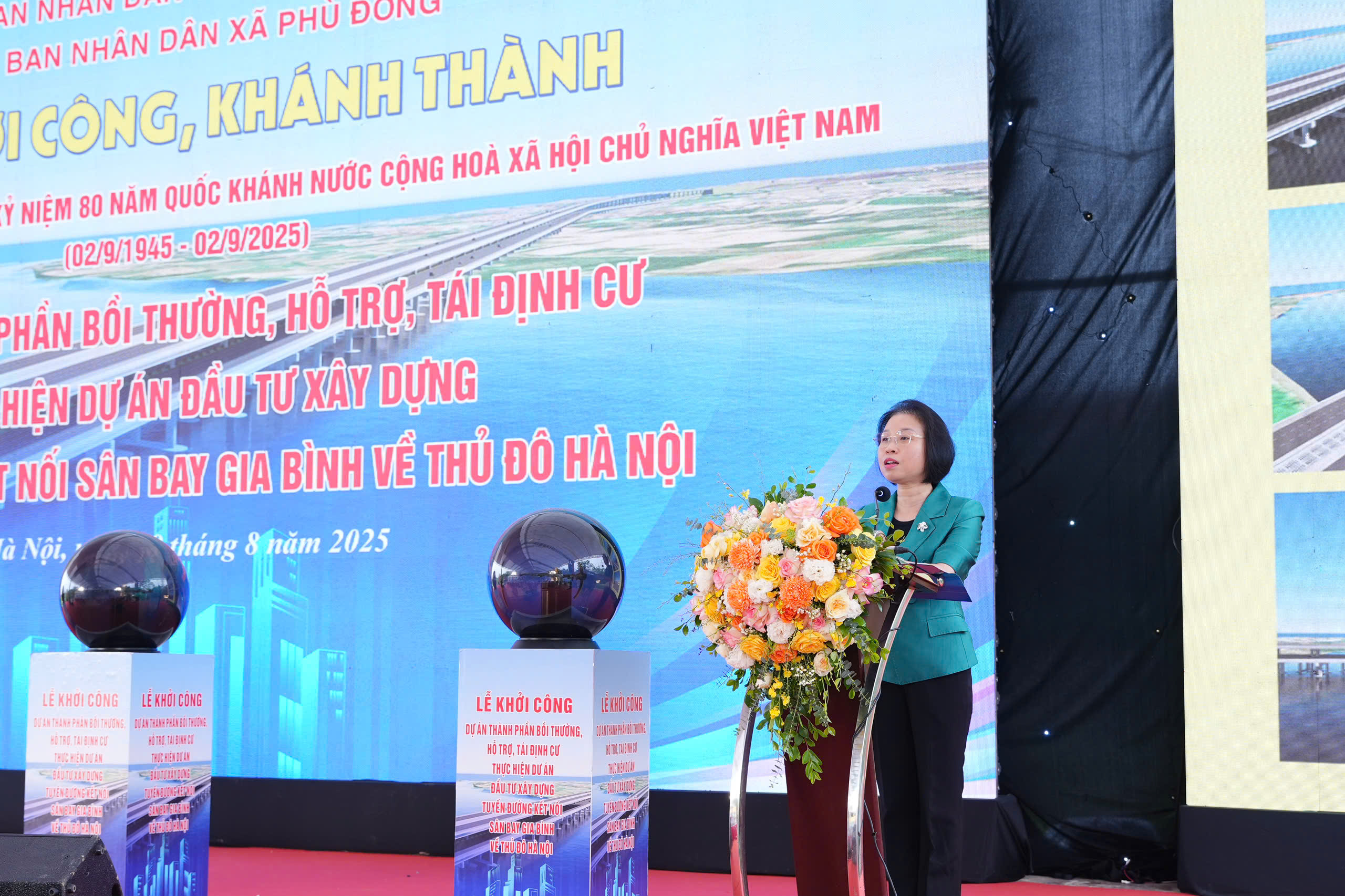 Phát biểu tại lễ khởi công, Phó Chủ tịch HĐND Thành phố Phạm Thị Thanh Mai cho biết, dự án thành phần bồi thường, hỗ trợ, tái định cư, thực hiện dự án đầu tư xây dựng tuyến đường kết nối sân bay Gia Bình về Thủ đô Hà Nội trên địa bàn xã Phù Đổng và xã Thuận An, thành phố Hà Nội. Dự án có tổng mức đầu tư 6.420 tỷ; tổng diện tích thu hồi đất trên địa bàn xã Phù Đổng khoảng 188ha thuộc 22 thôn, tổ dân phố trên địa bàn xã.