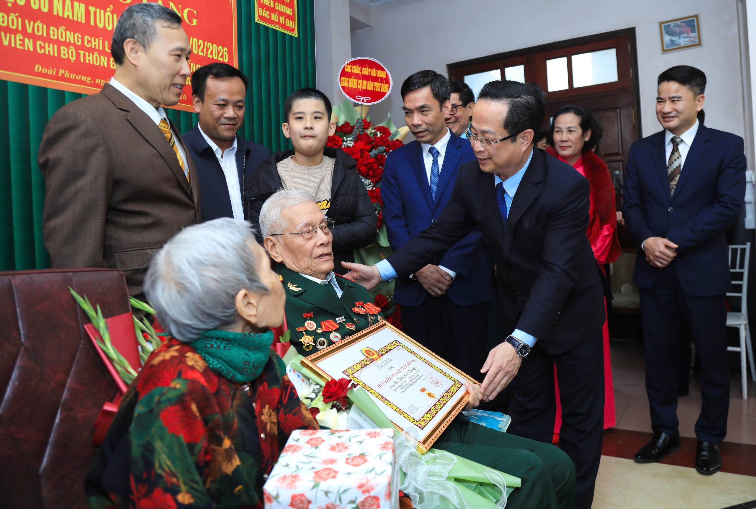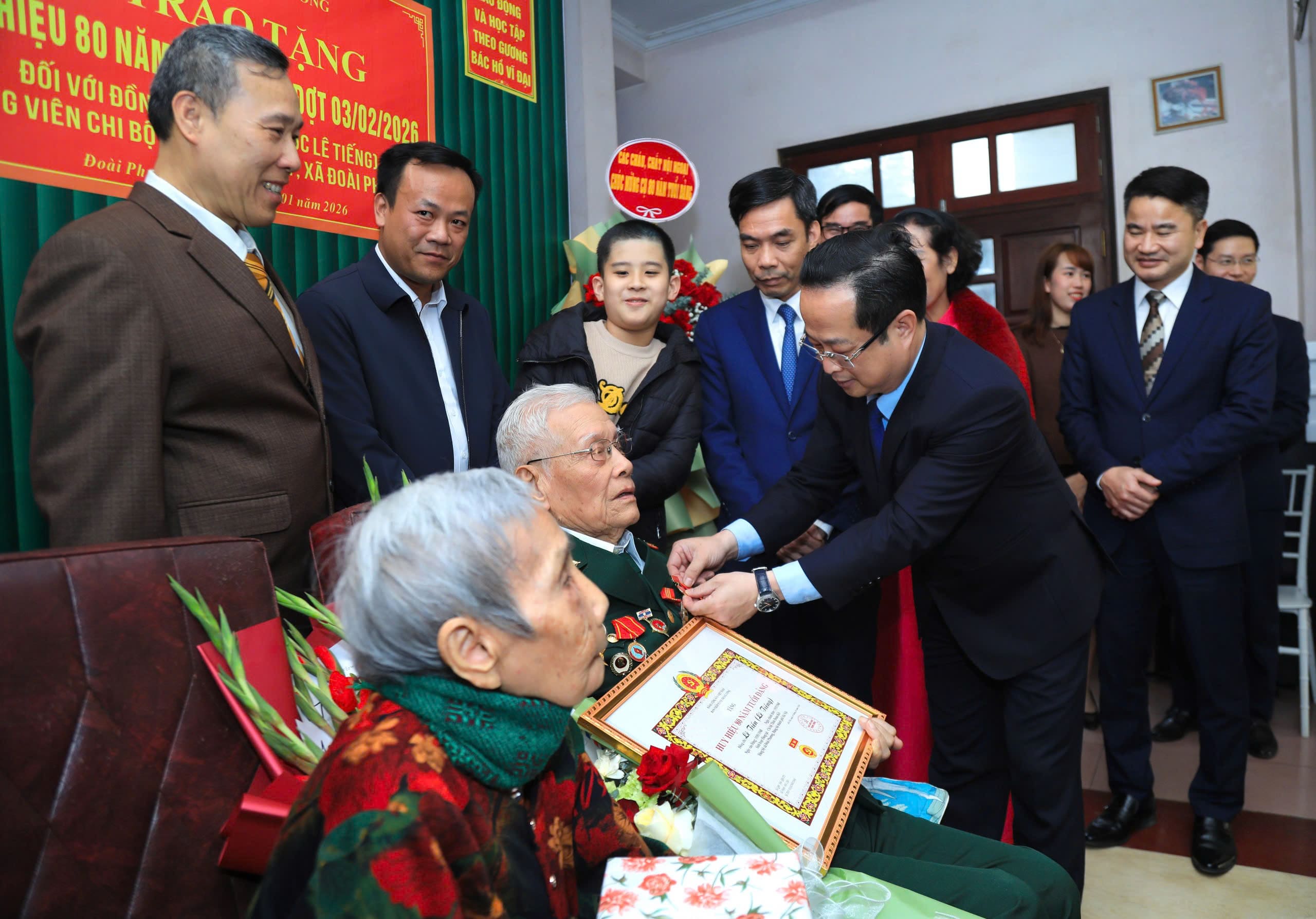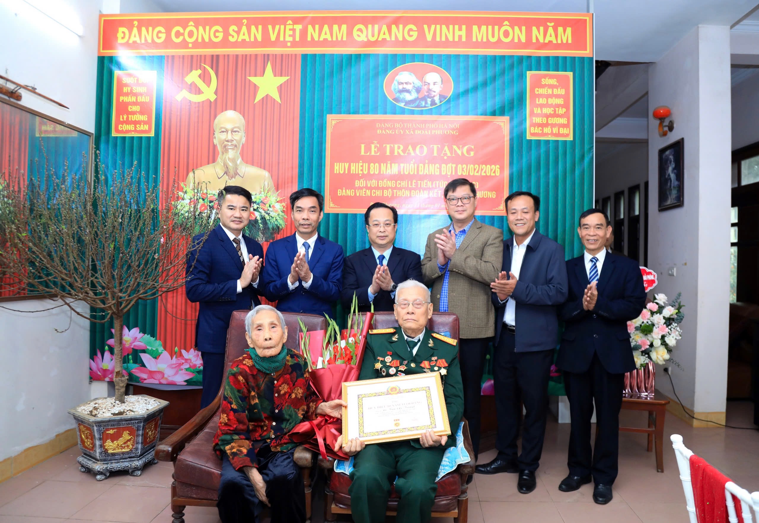 Chiều 31/01/2026, đồng chí Trần Thế Cương, Ủy viên Ban Thường vụ Thành ủy, Phó Chủ tịch Thường trực HĐND thành phố Hà Nội đã tới nhà riêng, trực tiếp trao Huy hiệu 80 năm tuổi Đảng tặng đồng chí Lê Tiến (tên khai sinh Lê Tiếng), đảng viên Chi bộ thôn Đoàn Kết, xã Đoài Phương.