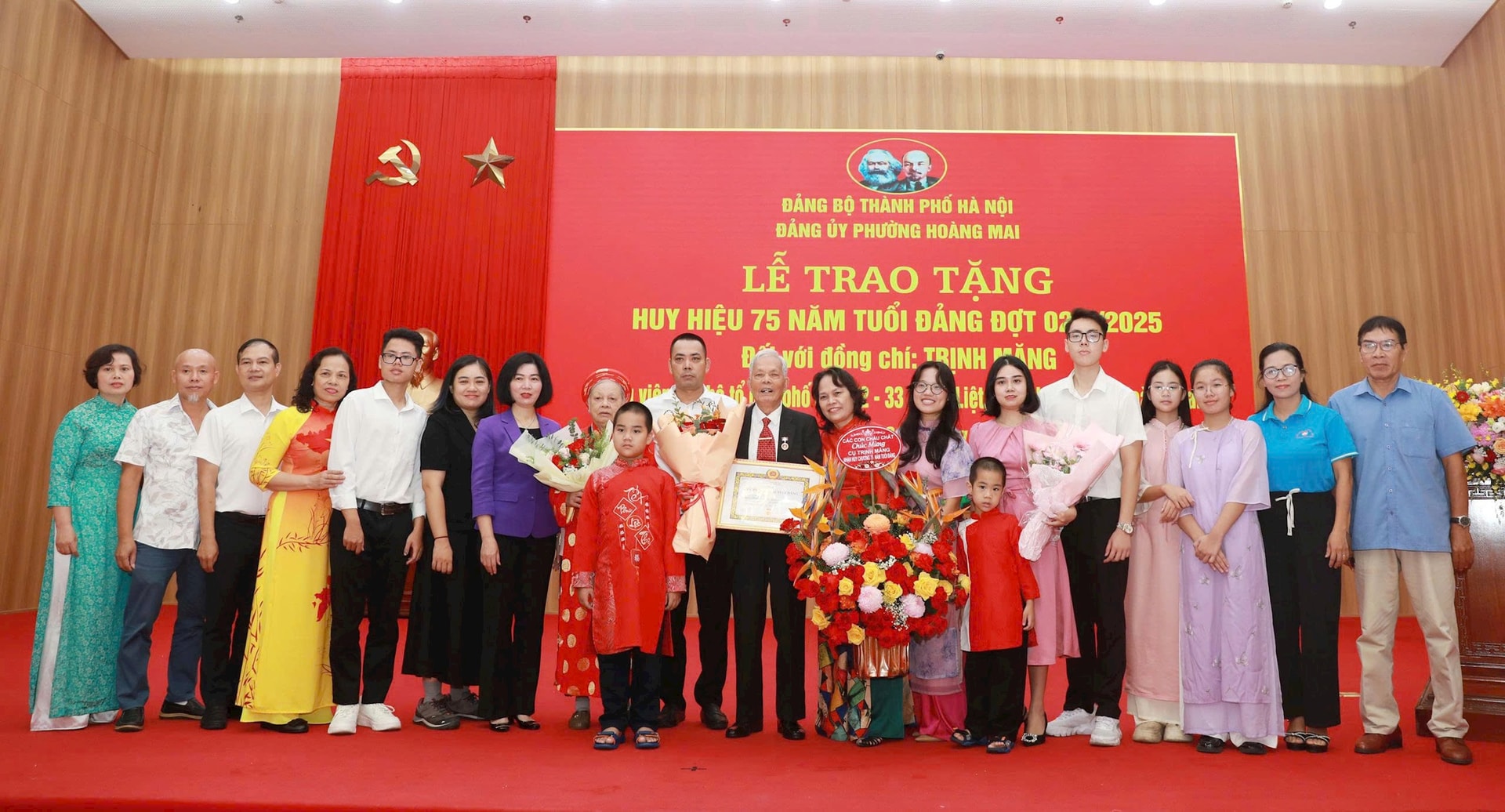Tại buổi lễ, Phó Chủ tịch Thường trực HĐND thành phố Phùng Thị Hồng Hà trao Huy hiệu 75 năm tuổi Đảng và tặng hoa chúc mừng đồng chí Trịnh Măng, sinh năm 1932. Trong dịp trao tặng Huy hiệu Đảng lần này, đảng viên Trần Thị Lập, sinh năm 1928, vinh dự nhận Huy hiệu 80 năm tuổi Đảng. Tuy nhiên, vì lý do sức khỏe, đồng chí Lập không tham dự được buổi lễ, Đảng ủy phường Hoàng Mai sẽ tổ chức trang trọng Lễ trao tặng Huy hiệu Đảng tại nhà riêng của đồng chí.