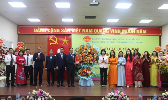 Phó Chủ tịch Thường trực HĐND thành phố Phùng Thị Hồng Hà trao các quyết định về tổ chức bộ máy phường Lĩnh Nam
