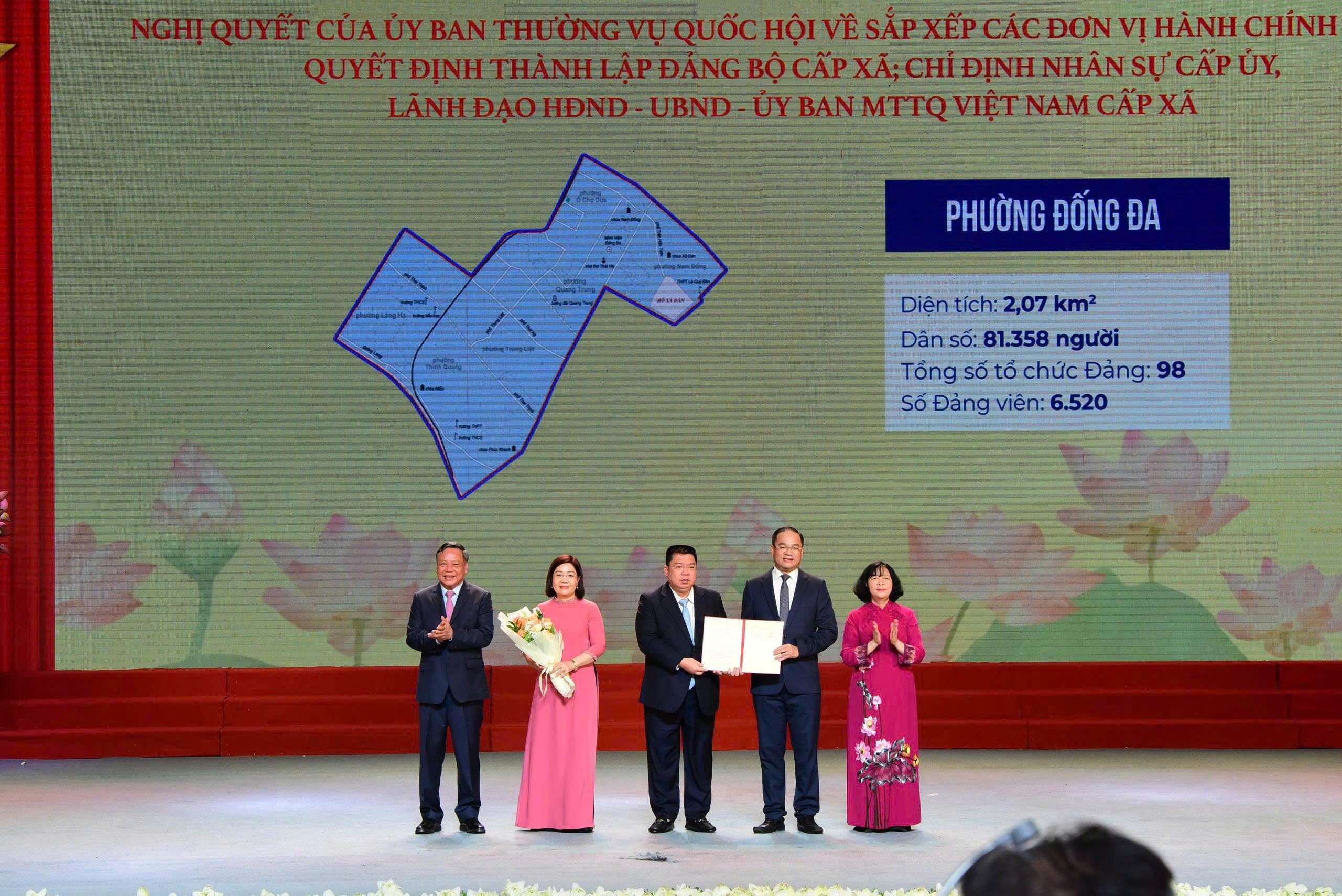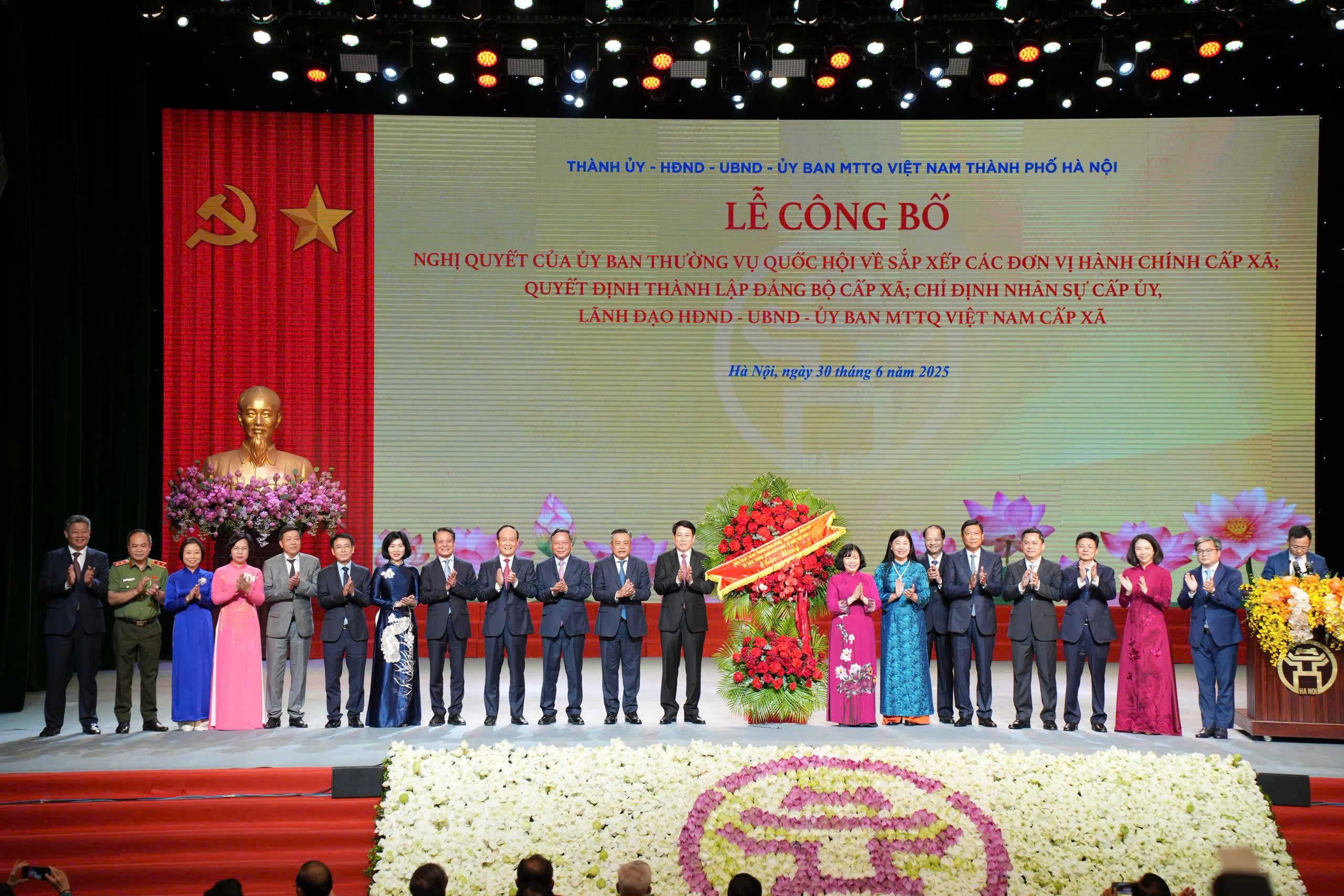 Sáng 30/6/2025, tại Cung Văn hóa lao động hữu nghị Việt - Xô, Thành uỷ - HĐND - UBND - Ủy ban MTTQ Việt Nam thành phố Hà Nội tổ chức Lễ công bố Nghị quyết của Quốc hội, Quyết định của Trung ương, Quyết định của Thành uỷ Hà Nội về sáp nhập đơn vị hành chính, thành lập các tổ chức Đảng, Mặt trận Tổ quốc Việt Nam thành phố, các xã, phường.