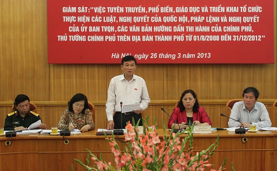 Chiều 26/3, Đoàn ĐBQH TP Hà Nội đã tổ chức giám sát tại UBND TP về “Việc tuyên truyền, phổ biến, giáo dục và triển khai tổ chức, thực hiện các Luật, Nghị quyết của Quốc hội, Pháp lệnh và Nghị quyết của UBTVQH, các văn bản hướng dẫn thi hành của Chính phủ, Thủ tướng Chính phủ trên địa bàn thành phố từ 1/8/2008 đến 31/12/2012. Đoàn giám sát do đồng chí Chu Sơn Hà, Phó trưởng Đoàn ĐBQH thành phố Hà Nội làm Trưởng đoàn cùng các thành viên là các vị ĐBQH và khách mời tham gia Đoàn giám sát.