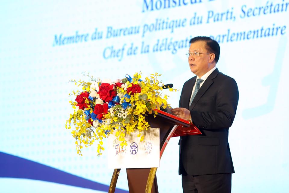 Phát biểu chỉ đạo Hội nghị, Bí thư Thành ủy, Trưởng đoàn đại biểu Quốc hội thành phố Hà Nội Đinh Tiến Dũng chia sẻ, hai nước Việt Nam và Pháp đã trải qua những giai đoạn lịch sử thăng trầm và vượt qua những “khúc quanh” để trở thành những người bạn đồng hành, tin cậy.