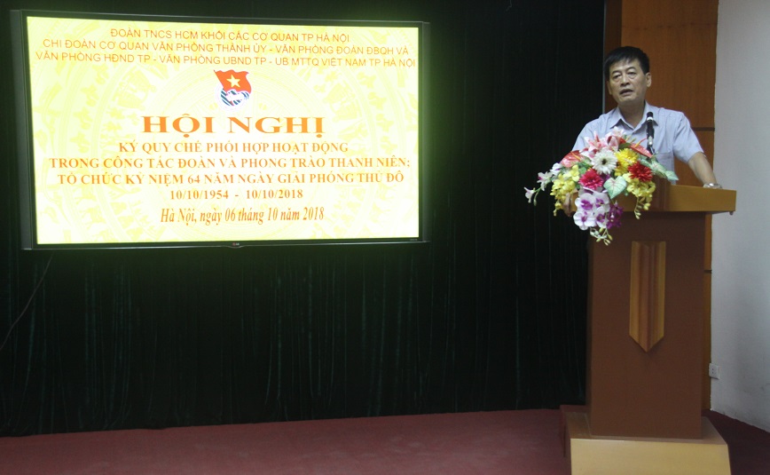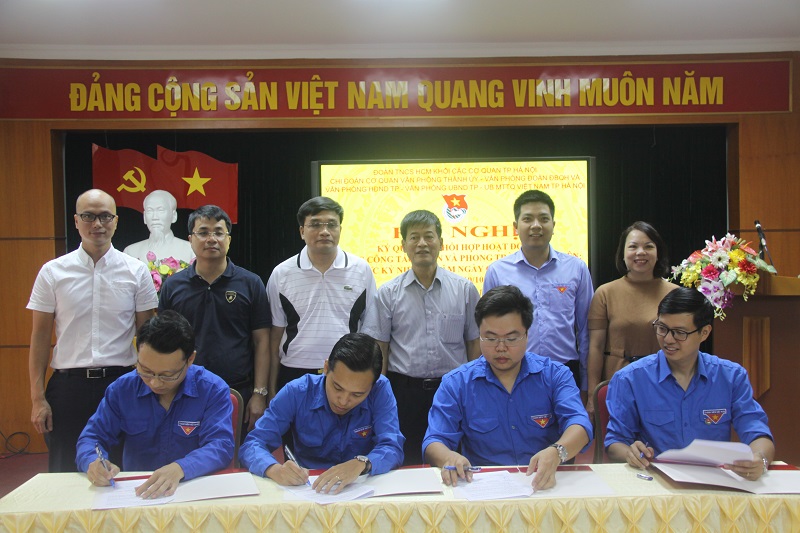 Ngày 06/10/2018, Ban chấp hành đoàn thanh niên các cơ quan Văn phòng Thành ủy - Văn phòng Đoàn ĐBQH Thành phố & Văn phòng HĐND Thành phố - Văn phòng UBND Thành phố - Ủy ban MTTQ Việt Nam thành phố Hà Nội tổ chức Hội nghị ký quy chế phối hợp trong công tác đoàn, phong trào thanh niên và tổ chức kỷ niệm 64 năm ngày Giải phóng Thủ đô 10/10/1954 - 10/10/2018.
