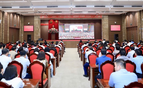 Quang cảnh hội nghị tại điểm cầu Thành ủy Hà Nội. Ảnh: Quang Thái