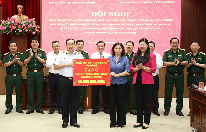 Lãnh đạo Ban Thường vụ Thành ủy Hà Nội đã trao kinh phí hỗ trợ 50 tỷ đồng cho Bộ Tư lệnh Hải quân xây dựng nhà văn hóa đa năng trên huyện đảo Trường Sa, tỉnh Khánh Hòa.