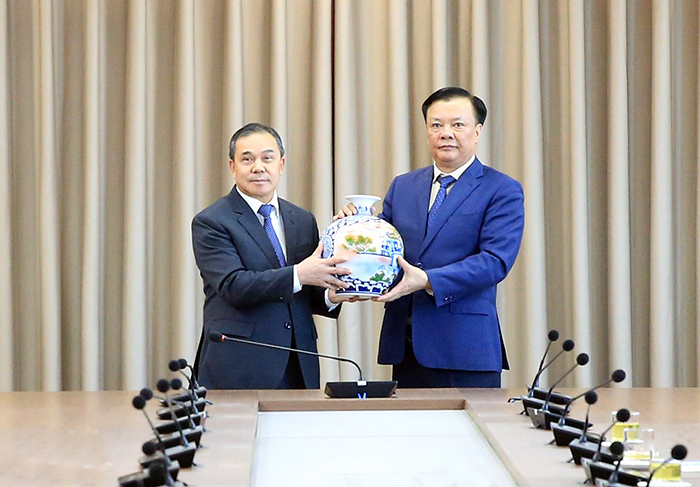 Bí thư Thành ủy Hà Nội Đinh Tiến Dũng tặng quà lưu niệm tới Đại sứ Cộng hòa dân chủ nhân dân Lào Sengphet Houngboungnuang