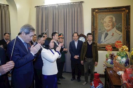 Bí thư Thành ủy Hà Nội Bùi Thị Minh Hoài cùng Đoàn đại biểu thành phố Hà Nội và đại diện gia đình Đại tướng Võ Nguyên Giáp tại nhà số 30 Hoàng Diệu. Ảnh: Viết Thành