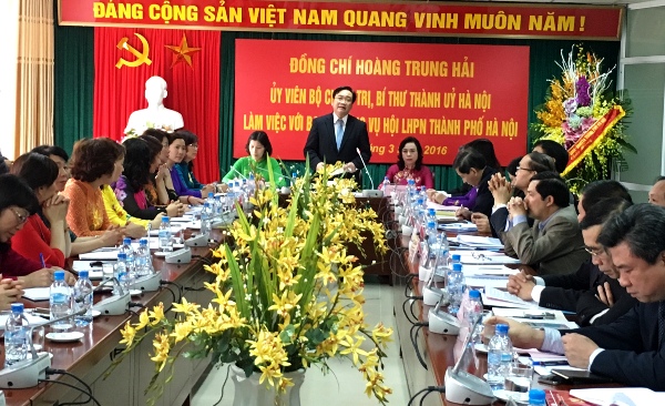 Nhân dịp kỷ niệm 106 năm Ngày Quốc tế Phụ nữ 8/3, chiều 4/3, đồng chí Hoàng Trung Hải, Ủy viên Bộ Chính trị, Bí thư Thành ủy Hà Nội dẫn đầu Đoàn công tác Thành ủy đã tới chúc mừng và làm việc với Hội Liên hiệp Phụ nữ Hà Nội về kết quả hoạt động của các cấp Hội phụ nữ Hà Nội năm 2015, nhiệm vụ trọng tâm năm 2016; dự Hội nghị gặp mặt nữ cán bộ chủ chốt Thành phố. Cùng dự có các đồng chí Ngô Thị Thanh Hằng, Ủy viên Trung ương Đảng, Phó Bí thư Thường trực Thành ủy Hà Nội; Nguyễn Thi Bích Ngọc, Phó Bí thư Thành ủy, Chủ tịch HĐND TP; Nguyễn Văn Sửu, Phó Chủ tịch UBND TP Hà Nội.