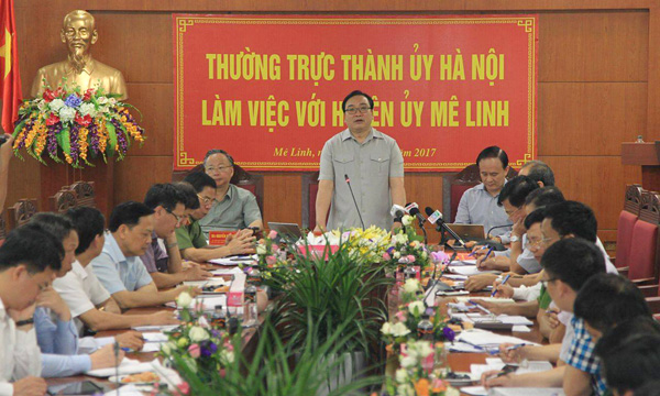 Sau khi nghe ý kiến phát biểu của lãnh đạo các sở, ngành, UBND TP, HĐND TP, Bí thư Thành ủy Hoàng Trung Hải biểu dương những kết quả mà Đảng bộ, chính quyền và nhân dân huyện Mê Linh đạt được trong năm 2016 cũng như 4 tháng đầu năm 2017. Tuy nhiên, Bí thư Thành ủy cũng cho rằng, tốc độ tăng trưởng của Mê Linh chưa tương xứng với tiềm năng, vị trí; tái cơ cấu kinh tế chưa đạt yêu cầu, công nghiệp - xây dựng có tăng nhưng giá trị tuyệt đối thấp, thu nhập bình quân đầu người còn thấp, tỷ lệ hộ nghèo của huyện vẫn còn cao so với mặt bằng chung của TP. Bên cạnh đó, thương mại - dịch vụ chưa phát triển tương xứng so với công nghiệp - xây dựng, mặc dù huyện có lợi thế gần sân bay Nội Bài. Cùng với đó, trách nhiệm một số cấp ủy, tính tiền phong, gương mẫu của một số cán bộ, đảng viên còn chưa đáp ứng yêu cầu.