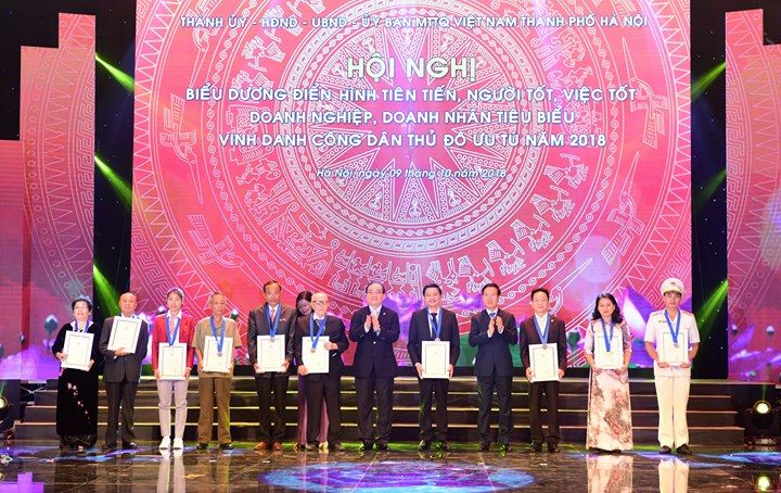 Sáng 9-10, tại Hà Nội, Thành ủy, HĐND, UBND, Ủy ban MTTQ Việt Nam thành phố Hà Nội trang trọng tổ chức “Hội nghị Biểu dương điển hình tiên tiến, người tốt việc tốt, doanh nghiệp, doanh nhân tiêu biểu và vinh danh Công dân Thủ đô ưu tú năm 2018”.