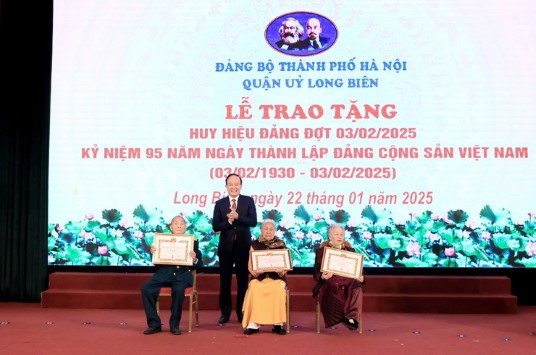 Dịp này, Ban Thường vụ Thành ủy Hà Nội đã quyết định tặng Huy hiệu 80 năm tuổi Đảng đối với 01 đồng chí, 75 năm tuổi Đảng đối với 01 đồng chí, 70 năm tuổi Đảng đối với 06 đồng chí; Huy hiệu 65 năm, 60 năm, 55 năm và 50 năm tuổi Đảng đối với 154 đảng viên thuộc Đảng bộ quận Long Biên.
