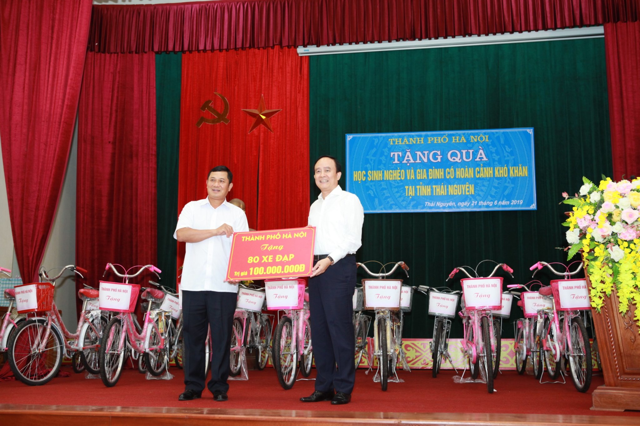 Phó Bí thư Thành ủy, Chủ tịch HĐND TP Nguyễn Thị Bích Ngọc đã trao tiền hỗ trợ xây dựng nhà ở cho 2 hộ nghèo với trị giá mỗi nhà 50 triệu đồng và một số đồ dùng sinh hoạt - đây là món quà từ sự đóng góp của Chủ tịch HĐND và một số đại biểu HĐND Thành phố. Ngoài ra, lãnh đạo thành phố Hà Nội đã trao tặng 20 xe đạp cho 20 cháu học sinh nghèo vượt khó đạt thành tích tốt trong học tập của huyện Đồng Hỷ, trao tặng 80 xe đạp chuyển tới Ủy ban MTTQ tỉnh để trao tới các cháu học sinh nghèo chăm ngoan học giỏi khác.