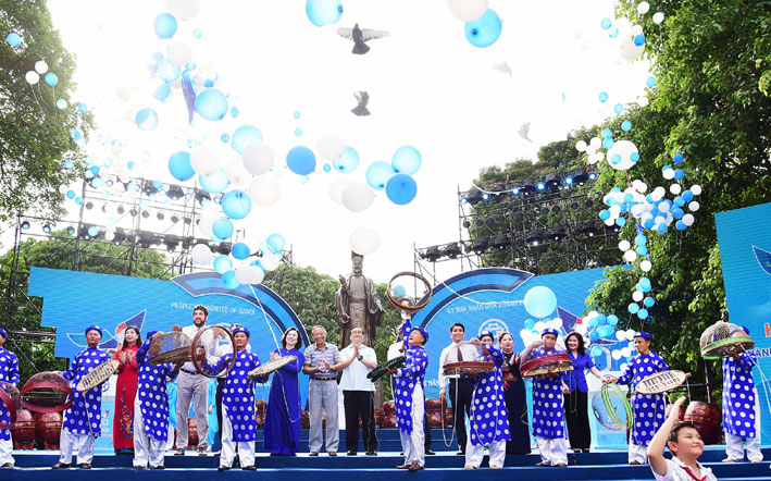 Các đại biểu dự Lễ kỷ niệm 20 năm thành phố Hà Nội được Tổ chức Giáo dục, Khoa học và Văn hóa của Liên hợp quốc (UNESCO) trao tặng danh hiệu “Thành phố Vì hòa bình” thả chim bồ câu với thông điệp thể hiện khát vọng hòa bình, thịnh vượng. Ảnh: Viết Thành