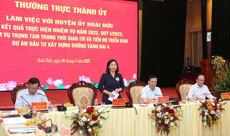 Tại buổi làm việc, các đồng chí Thường trực Thành ủy ghi nhận, đánh giá cao kết quả mà huyện Hoài Đức đã đạt được, đồng thời đề nghị trong thời gian tới, huyện chú trọng bảo tồn, phát huy các giá trị văn hóa truyền thống, nhất là trong quá trình đô thị hóa, phát triển huyện lên quận. Huyện cũng cần quan tâm phát triển thương mại, dịch vụ và du lịch; quá trình phát triển phải tính đến yếu tố liên kết vùng với tầm nhìn dài hạn.