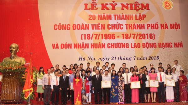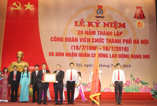 Sáng 21/7, Công đoàn Viên chức thành phố Hà Nội long trọng tổ chức Lễ kỷ niệm 20 năm thành lập (18/7/1996 - 18/7/2016) và đón nhận Huân chương Lao động hạng Nhì. Tham dự buổi lễ có các đồng chí: Nguyễn Giang Tuệ Minh, Phó Chủ tịch Thường trực CĐVC Việt Nam; Nguyễn Văn Sửu, Phó Chủ tịch UBND TP Hà Nội.