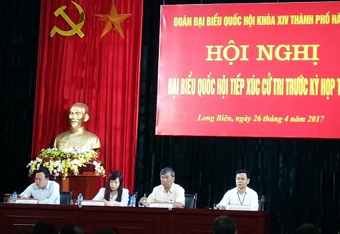 Tại Quận Long Biên: Có 17 ý kiến cử tri phát biểu, các ý kiến phát biểu tập trung vào những vấn đề như xây dựng pháp luật, chế độ chính sách, ô nhiễm môi trường, phòng chống tham nhũng, đền bù giải phóng mặt bằng, quản lý đô thị…