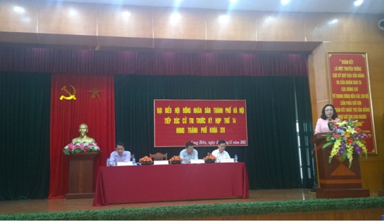 Phó Bí thư Thường trực Thành ủy Ngô Thị Thanh Hằng phát biểu tại buổi tiếp xúc cử tri quận Long Biên Tại buổi tiếp xúc cử tri, Tổ đại biểu báo cáo nội dung trả lời kiến nghị cử tri tại kỳ họp thứ 13 và thông báo nội dung kỳ họp thứ 14 HĐND TP khóa XIV HĐND Thành phố, báo cáo tóm tắt tình hình phát triển kinh tế - xã hội, an ninh quốc phòng năm 2015 của Thành phố; thông báo trả lời ý kiến, kiến nghị của cử tri tại các buổi tiếp xúc trước đó. Ý kiến của cử tri quận Long Biên có chung ghi nhận, đánh giá cao kết quả thực hiện các chỉ tiêu kinh tế - xã hội, an ninh quốc phòng năm 2015 của Thành phố. Với tinh thần trách nhiệm, dân chủ đã cử tri đã có 14 ý kiến phản ánh tập trung về các vấn đề xử lý ô nhiễm môi trường, chăm sóc cắt tỉa cây xanh, giao thông đô thị, xây dựng trường mầm non. Cử tri phường Cự Khối kiến nghị nút giao cầu Thanh Trì – đường 5 thi công chậm, xe chở vật liệu rơi vãi nhiều gây tắc cống, ngập cục bộ tại tổ 13. Đề nghị Thành phố chỉ đạo nhà thầu thực hiện xử lý. Cử tri phường Đức Giang kiến nghị: Tổ dân phố số 27 luôn bị ngập nặng khi mưa lớn và 3000 m2 đất công do công ty nhà quản lý đang bị lấn chiếm và và đổ rác trộm trầm trọng. Đề nghị Thành phố quan tâm chỉ đạo công ty nhà số 6 phải có biện pháp xử lý. Cử tri phường Ngọc Thụy kiến nghị Thành phố xem xét việc di chuyển nghĩa trang Ngọc Thụy và mở tuyến xe buýt dọc đường Ngọc Thụy – Cầu Đuống mới mở, cắm biển giao thông dọc tuyến đường. Phát biểu tại buổi tiếp xúc cử tri, Phó Bí thư Thường trực Thành ủy Ngô Thị Thanh Hằng đã trả lời một số ý kiến của cử tri, tổng hợp, tiếp thu các ý kiến để chuyển đến các cơ quan có trách nhiệm giải quyết. Chiều ngày 10/11 tại UBND thị trấn Đông Anh, Đại biểu HĐND Thành phố đơn vị bầu cử số 21 TXCT trước kỳ họp thứ 14 HĐND Thành phố, khóa XIV. Đại biểu Nguyễn Thị Mai Sương - Giám đốc Ngân hàng Nhà nước thành phố Hà Nội, thông báo tới cử tri huyện Đông Anh nội dung, thời gian tổ chức kỳ họp thứ 14 HĐND Thành phố, khóa XIV.