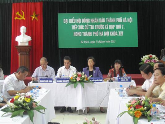 Ngày 11/6, đại biểu HĐND TP đã đồng loạt tiếp xúc với cử tri trên địa bàn thành phố trước kỳ họp thứ 7 HĐND TP khóa XIV. Tại buổi tiếp xúc, cử tri đã được thông tin về tình hình thực hiện nhiệm vụ phát triển kinh tế - xã hội, an ninh, quốc phòng 6 tháng đầu năm và phương hướng, nhiệm vụ 6 tháng cuối năm 2013, đồng thời được nghe đại biểu HĐND TP báo cáo trả lời kiến nghị cử tri tại kỳ tiếp xúc trước. * UVTW Đảng, Phó Bí thư Thành ủy, Chủ tịch HĐND Thành phố Ngô Thị Doãn Thanh đã cùng các đại biểu: Hoàng Trọng Quyết, Thành ủy viên, Bí thư Quận ủy, Chủ tịch HĐND quận Ba Đình; Nguyễn Quốc Khánh, Phó Tổng giám đốc Công ty TNHH Nhà nước MTV Chiếu sáng và thiết bị đô thị đã tiếp xúc với cử tri quận Ba Đình.