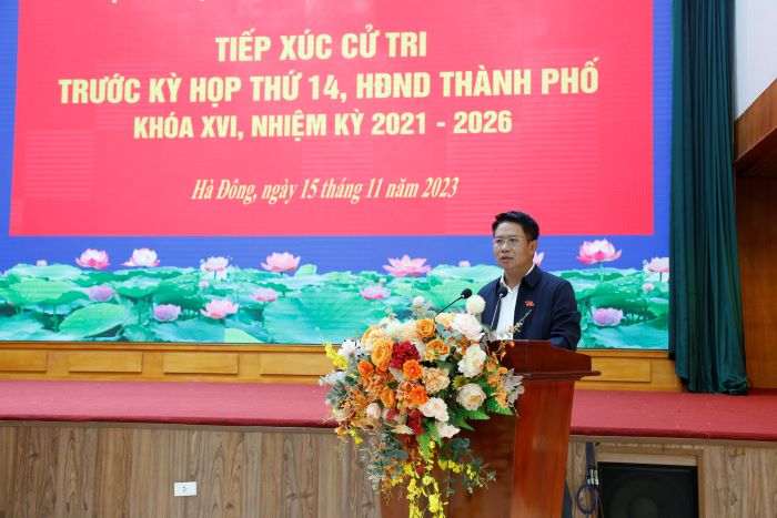 Tại buổi tiếp xúc, thay mặt Tổ đại biểu HĐND thành phố Hà Nội (Đơn vị bầu cử số 10), đại biểu Nguyễn Thanh Xuân - Bí thư Quận ủy Hà Đông đã thông báo với cử tri về nội dung, thời gian và công tác chuẩn bị tổ chức Kỳ họp thường lệ cuối năm 2023 (kỳ họp thứ mười bốn) HĐND Thành phố khóa XVI, nhiệm kỳ 2021-2026.