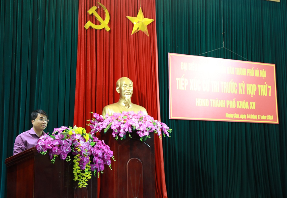 Cử tri Đào Văn Hùng - Trưởng thôn Yến Vỹ bày tỏ sự phấn khởi, đồng tình, nhất trí báo cáo của HĐND Thành phố. Ông Hùng kiến nghị cần có quy hoạch tổng thể quần thể di tích thắng cảnh Hương Sơn, đặc biệt giao thông TL 419, TL 425 nhỏ hẹp không đáp ứng nhu cầu đi lại của người dân và sự phát triển của khu di tích Quốc gia đặc biệt. Với dân số hơn 23.000 dân, gắn với quần thể di tích Quốc gia đặc biệt, Thành phố nên nghiên cứu, xem xét nâng cấp xã Hương Sơn thành thị trấn để có định hướng phát triển toàn diện.