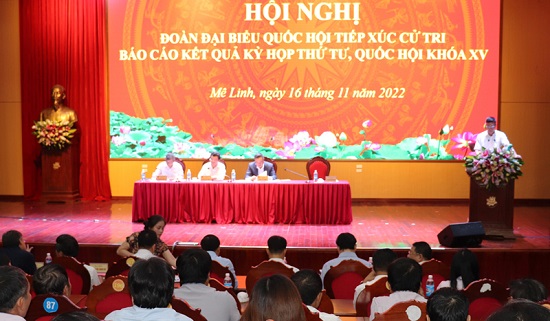 Nhất trí và đánh giá cao nội dung kỳ họp thứ tư, Quốc hội khóa XV, cử tri hai huyện Mê Linh và Sóc Sơn tiếp tục nêu 7 ý kiến với 8 nội dung tới Đoàn đại biểu Quốc hội thành phố Hà Nội, bao gồm: Việc xem xét các dự án và công tác kiểm tra, rà soát, xử lý dứt điểm các dự án chậm triển khai trên địa bàn; giải pháp nâng cao chất lượng giáo dục; tình trạng một số giáo viên và y, bác sĩ chuyển công tác từ khu vực công lập sang dân lập, chế độ tiền lương; quỹ đất tái định cư liên quan đến công tác giải phóng mặt bằng; chính sách hỗ trợ, đền bù giải phóng mặt bằng đường Vành đai 4 và một số nội dung giao đất dịch vụ; tháo gỡ vướng mắc cho Nhân dân phát triển sản xuất nông nghiệp vùng đất bãi ven sông Hồng; đường dân sinh qua đường sắt, việc đầu tư mở rộng quốc lộ 3 tại huyện Sóc Sơn...