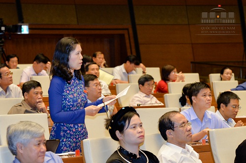 Đại biểu Trần Thị Phương Hoa, Hoàng Văn Cường phát biểu thảo luận về việc tách nội dung bồi thường, hỗ trợ tái định cư thành dự án thành phần để triển khai dự án Cảng hàng không quốc tế Long Thành