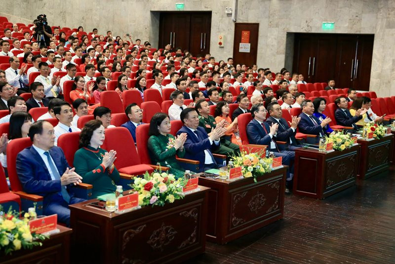 Bí thư Thành ủy Hà Nội Đinh Tiến Dũng với các đại biểu dự đại hội.