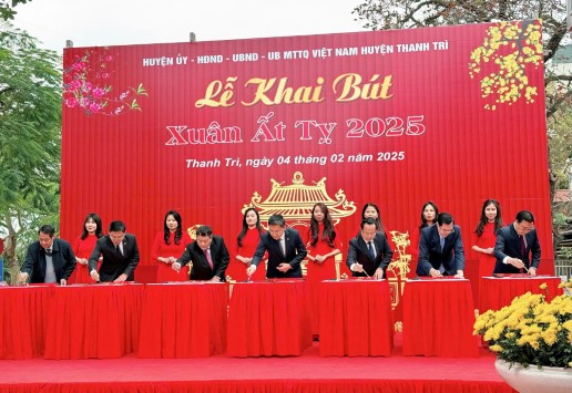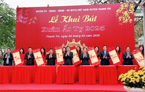 Phó Chủ tịch UBND thành phố Hà Nội Hà Minh Hải, lãnh đạo huyện Thanh Trì và thị xã Chí Linh (tỉnh Hải Dương) đã thực hiện nghi lễ khai bút đầu xuân Ất Tỵ 2025. Ảnh: Phương Xuyến