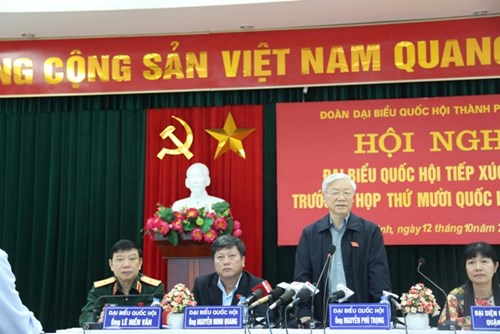 Tổng Bí thư Nguyễn Phú Trọng tiếp thu và giải đáp ý kiến của cử triThay mặt các Đại biểu Quốc hội đơn vị bầu cử số 1, Đoàn đại biểu Quốc hội thành phố Hà Nội, Tổng Bí thư Nguyễn Phú Trọng cảm ơn những ý kiến phong phú, tâm huyết, xác đáng, xây dựng của cử tri, phản ánh đúng thực tế, thể hiện sự quan tâm đối với hoạt động của các cơ quan Đảng, Nhà nước, Quốc hội. Tổng Bí thư chỉ rõ: Kỳ họp sắp tới của Quốc hội là kỳ họp cuối của năm 2015 và cũng sắp là kỳ họp cuối của nhiệm kỳ Quốc hội khóa XIII. Dự kiến chương trình thông qua 17 dự thảo luật, cho ý kiến 9 dự án luật khác, trong đó có nhiều luật khó, nhiều vấn đề mới... Quốc hội cũng sẽ giám sát tối cao, chất vấn và trả lời chất vấn, cho ý kiến về các báo cáo, quyết định vấn đề ngân sách... nội dung nhiều, phong phú, yêu cầu đòi hỏi cao. Vì vậy, Quốc hội đang tập trung chuẩn bị tốt nhất cho kỳ họp này. Quốc hội sẽ xem xét báo cáo kết quả thực hiện nhiệm vụ phát triển kinh tế - xã hội năm 2015, cho ý kiến về kế hoạch phát triển kinh tế - xã hội năm 2016, đây là nhiệm vụ trung tâm. Tổng Bí thư nhất trí với ý kiến của nhiều cử tri đánh giá tình hình kinh tế - xã hội đất nước từ đầu năm đến nay đạt nhiều kết quả khá toàn diện, trên các lĩnh vực kinh tế, văn hóa - xã hội, quốc phòng an ninh và đối ngoại, bảo vệ vững chắc độc lập chủ quyền của Tổ quốc, vai trò vị thế đất nước không ngừng được nâng cao... Không khí trong xã hội, trong nhân dân phấn khởi. Tuy nhiên, đất nước còn nhiều khó khăn, thách thức trước mắt. Vừa rồi ký một loạt Hiệp định thương mại tự do, sắp tới hội nhập sân chơi chung sẽ phải sửa một loạt luật cho phù hợp, làm sao hội nhập nhưng không hòa tan, vẫn giữ được bản sắc, độc lập tự chủ, chế độ chính trị của chúng ta. Rồi các vấn đề về thời tiết, biến đổi khí hậu, nước biển dâng... cần phát huy thời cơ, phát huy điểm đồng, hạn chế các thách thức, bất đồng, Tổng Bí thư nhấn mạnh.