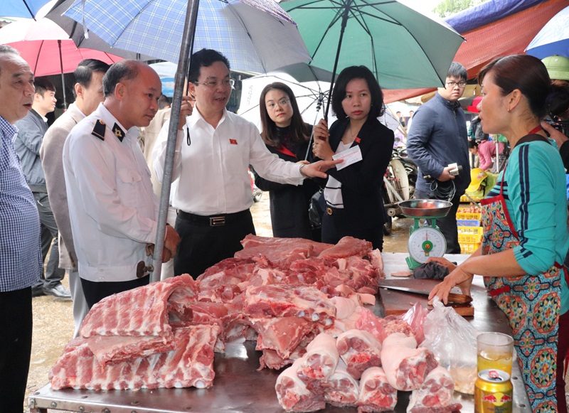 Đoàn giám sát khu vực bán thực phẩm của chợ Minh Khai