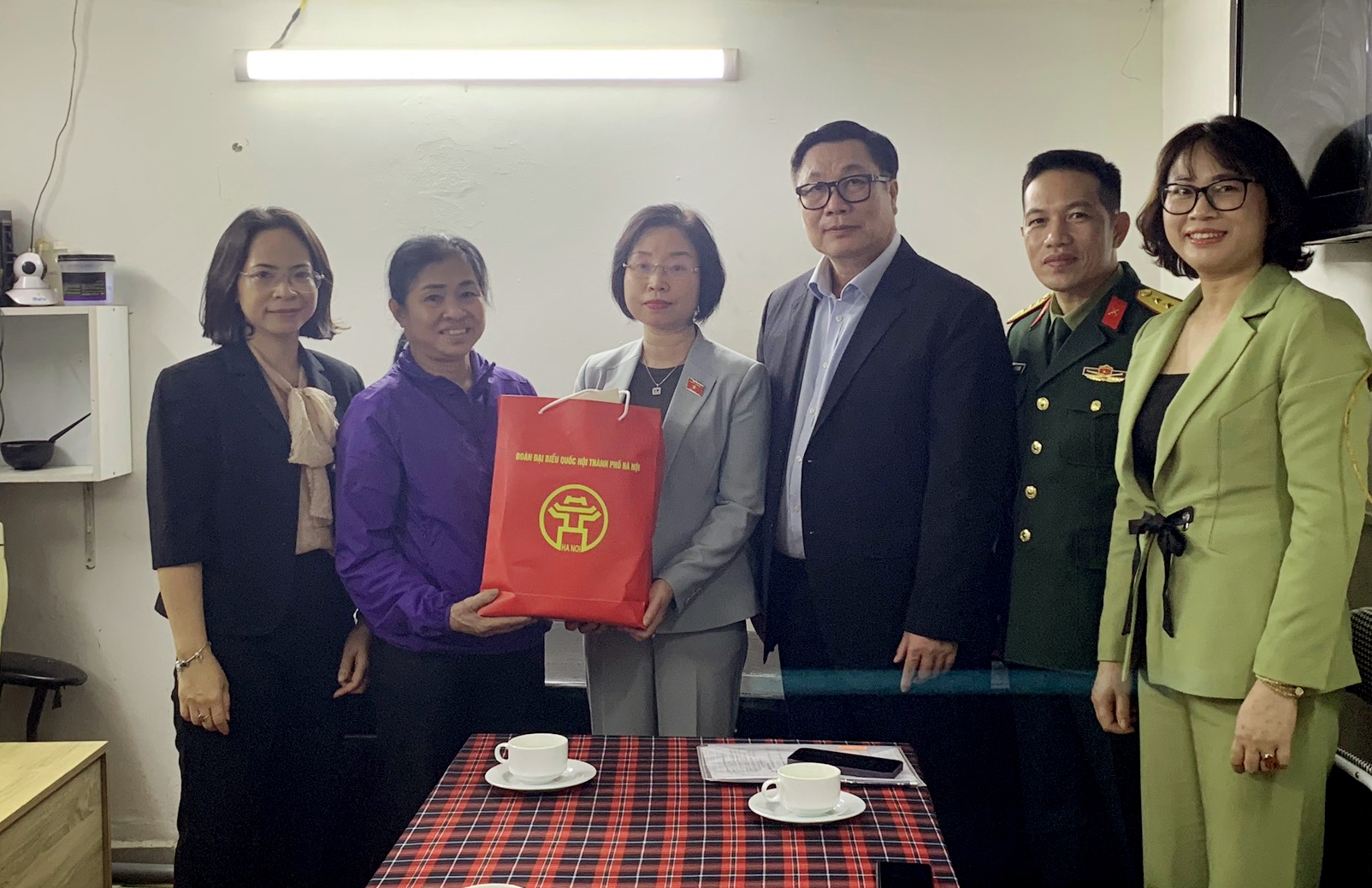 Tiếp đó, Đoàn đã thăm, chúc Tết, tặng 10 suất quà cho hộ có hoàn cảnh khó khăn, gia đình chính sách tiêu biểu trên địa bàn quận Nam Từ Liêm. Tại đây, Đoàn đã trao quà tặng gia đình bà Phạm Thị Hạnh, hộ cận nghèo trên địa bàn phường Trung Văn. Bà Hạnh làm thợ sơn tự do, chồng sức khỏe yếu, đi lại khó khăn. Các con của bà không có công việc ổn định và sống ở nơi khác. Vì vậy, hai vợ chồng bà sống với nhau, không có lương hưu, đau ốm thường xuyên.
