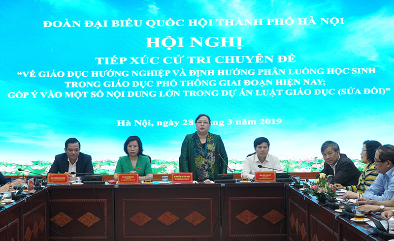 Chiều 28-3, Đoàn đại biểu Quốc hội thành phố Hà Nội tổ chức hội nghị tiếp xúc cử tri chuyên đề: “Giáo dục hướng nghiệp và định hướng phân luồng học sinh trong giáo dục phổ thông giai đoạn hiện nay; góp ý vào một số nội dung lớn trong dự án Luật Giáo dục (sửa đổi)”. Phó Bí thư Thành ủy, Chủ tịch HĐND thành phố, Phó Trưởng đoàn đại biểu Quốc hội TP Hà Nội Nguyễn Thị Bích Ngọc chủ trì hội nghị.