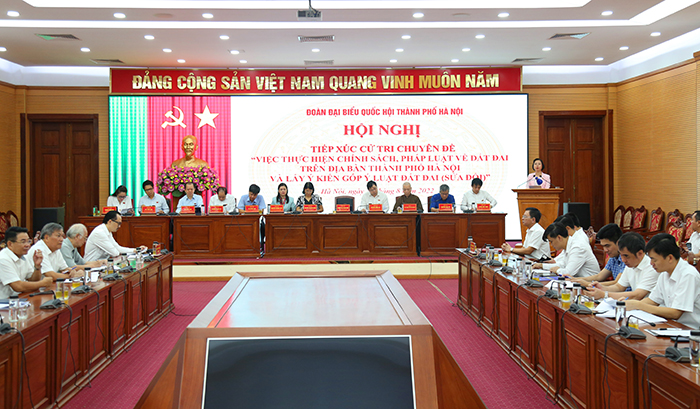 Sáng 23/8/2022, tại trụ sở UBND quận Nam Từ Liêm, Đoàn đại biểu Quốc hội thành phố Hà Nội tổ chức hội nghị tiếp xúc cử tri chuyên đề về việc thực hiện chính sách pháp luật về đất đai trên địa bàn thành phố và lấy ý kiến góp ý Luật Đất đai (sửa đổi).