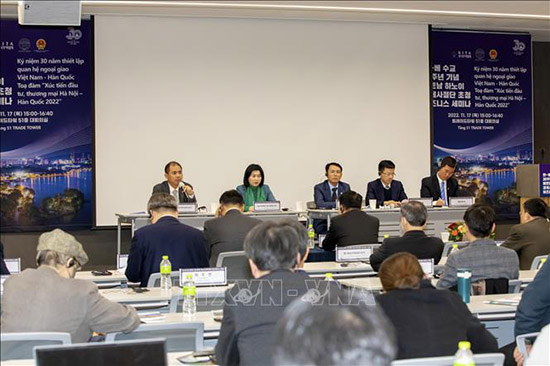 Cùng ngày (17-11), UBND thành phố Hà Nội phối hợp với Đại sứ quán Việt Nam tại Hàn Quốc và Hiệp hội Thương mại Hàn Quốc (KITA) tổ chức tọa đàm "Xúc tiến đầu tư, thương mại Hà Nội - Hàn Quốc 2022” tại Seoul. Cùng tham dự sự kiện có Tham tán Công sứ Đại sứ quán Việt Nam tại Hàn Quốc Nguyễn Việt Anh, Phó Chủ tịch KITA Kim Hyun-chul, cùng hơn 100 doanh nghiệp Hàn Quốc đang có mong muốn đầu tư vào thành phố Hà Nội.
