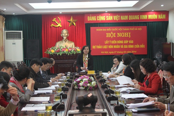 Sáng 27/2, Đoàn ĐBQH Thành phố Hà Nội đã tổ chức hội nghị lấy ý kiến đóng góp vào Luật Hôn nhân và gia đình (sửa đổi). Đồng chí Nguyễn Thị Hồng Hà Phó Trưởng Đoàn ĐBQH chủ trì, cùng sự tham dự của các vị ĐBQH trong Đoàn, đại diện lãnh đạo, chuyên gia của một số sở, ban ngành, quận huyện, phường trên địa bàn Thành phố và trường Đại học có liên quan.