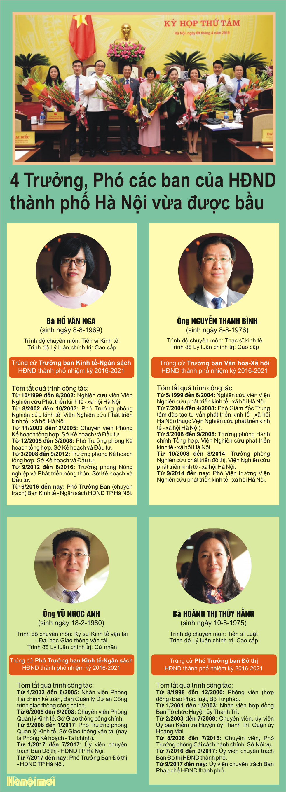 Căn cứ vào kết quả kiểm phiếu trên, bà Hồ Vân Nga trúng cử Trưởng ban Kinh tế - Ngân sách HĐND thành phố; ông Vũ Ngọc Anh trúng cử Phó Trưởng ban Kinh tế - Ngân sách HĐND thành phố; ông Nguyễn Thanh Bình trúng cử Trưởng ban Văn hóa - Xã hội HĐND thành phố; bà Hoàng Thị Thuý Hằng trúng cử Phó Trưởng ban Đô thị HĐND thành phố nhiệm kỳ 2016-2021.