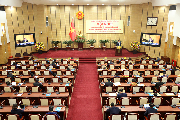 Sáng 14/01/2022, Thường trực HĐND thành phố Hà Nội tổ chức Hội nghị tổng kết hoạt động của HĐND các cấp thành phố năm 2021, triển khai nhiệm vụ trọng tâm năm 2022. Hội nghị được tổ chức theo hình thức trực tiếp kết hợp trực tuyến từ điểm cầu HĐND thành phố đến các sở, ngành, quận, huyện, thị xã và các xã, thị trấn toàn thành phố với 449 điểm cầu, 1.993 đại biểu tham dự.