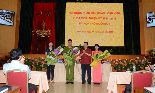 Đồng chí Hoàng Công Khôi Thành ủy viên, Bí thư Quận ủy, Chủ tịch HĐND quận tặng hoa chúc mừng các đồng chí được bầu bổ sung các chức danh của HĐND quận và Ủy viên UBND quận.
