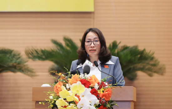 Phó trưởng Ban Pháp chế HĐND thành phố Hà Nội Hoàng Thị Thuý Hằng trình bày báo cáo thẩm tra
