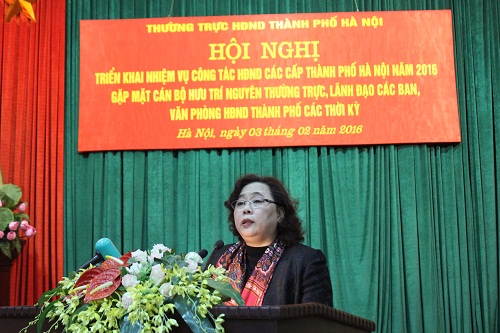Ngày 3-2, Thường trực HĐND thành phố Hà Nội tổ chức hội nghị triển khai nhiệm vụ công tác HĐND các cấp thành phố Hà Nội năm 2016 và gặp mặt cán bộ hưu trí nguyên Thường trực, lãnh đạo các Ban, Văn phòng HĐND Thành phố các thời kỳ. Phó Bí thư Thành ủy, Chủ tịch HĐND Thành phố Nguyễn Thị Bích Ngọc chủ trì hội nghị.