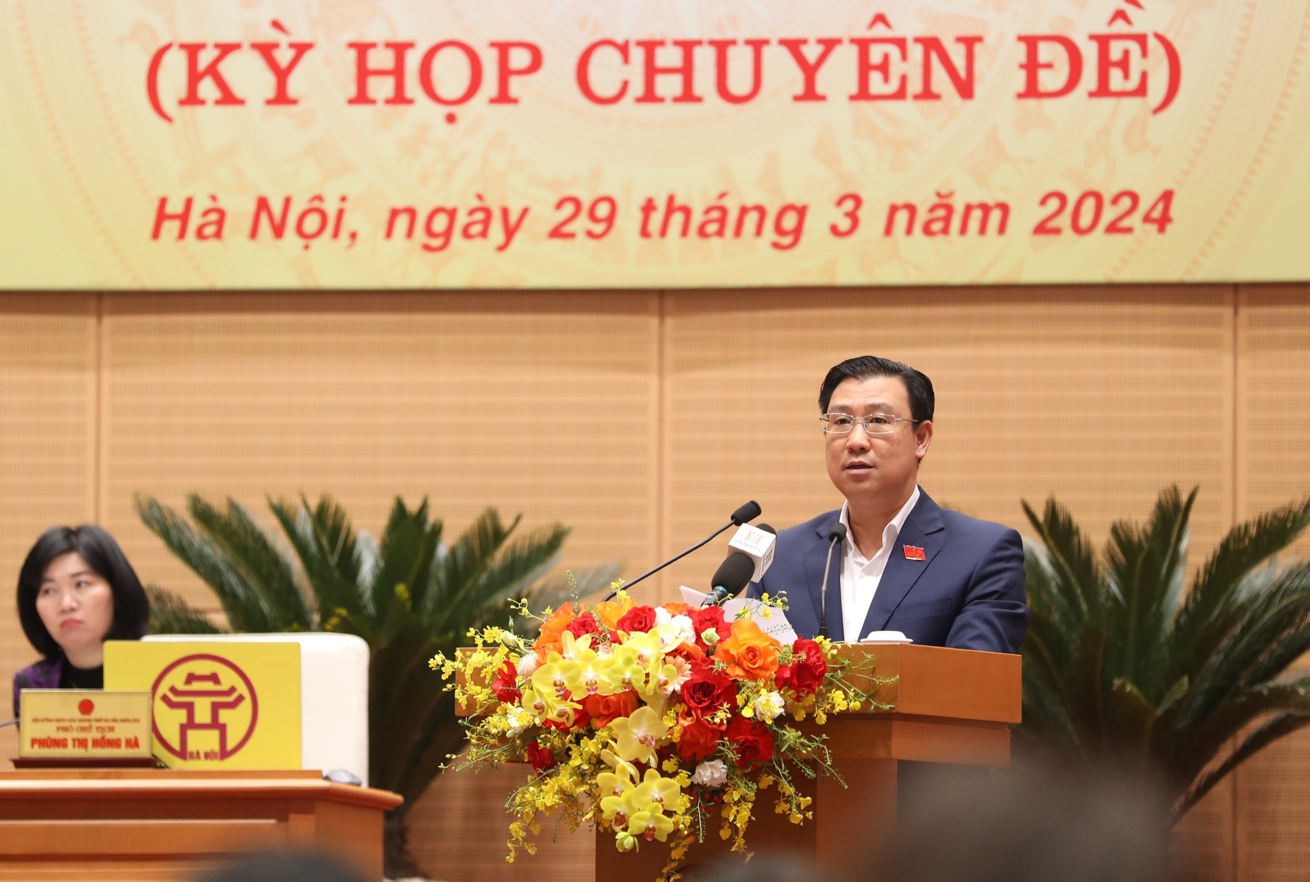 Trưởng ban Văn hoá-Xã hội HĐND Thành phố Nguyễn Thanh Bình trình bày báo cáo thẩm tra nghị quyết về lĩnh vực y tế