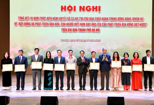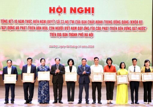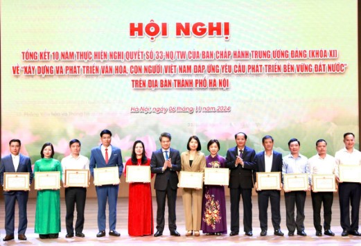 Tại Hội nghị, Ban tổ chức trao Bằng khen của Ban Thường vụ Thành uỷ và Bằng khen của UBND thành phố Hà Nội cho các tập thể, cá nhân có thành tích xuất sắc trong tổ chức triển khai thực hiện Nghị quyết số 33 - NQ/TU của Ban Chấp hành Trung ương khoá XI trên địa bàn thành phố Hà Nội.