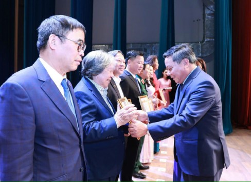 Thứ trưởng Bộ Văn hóa Thể thao và Du lịch Tạ Quang Đông, Phó Bí thư Thành ủy Nguyễn Văn Phong trao Bằng khen của Ban Thường vụ Thành ủy cho 10 tập thể, 10 cá nhân. Ảnh: Viết Thành.
